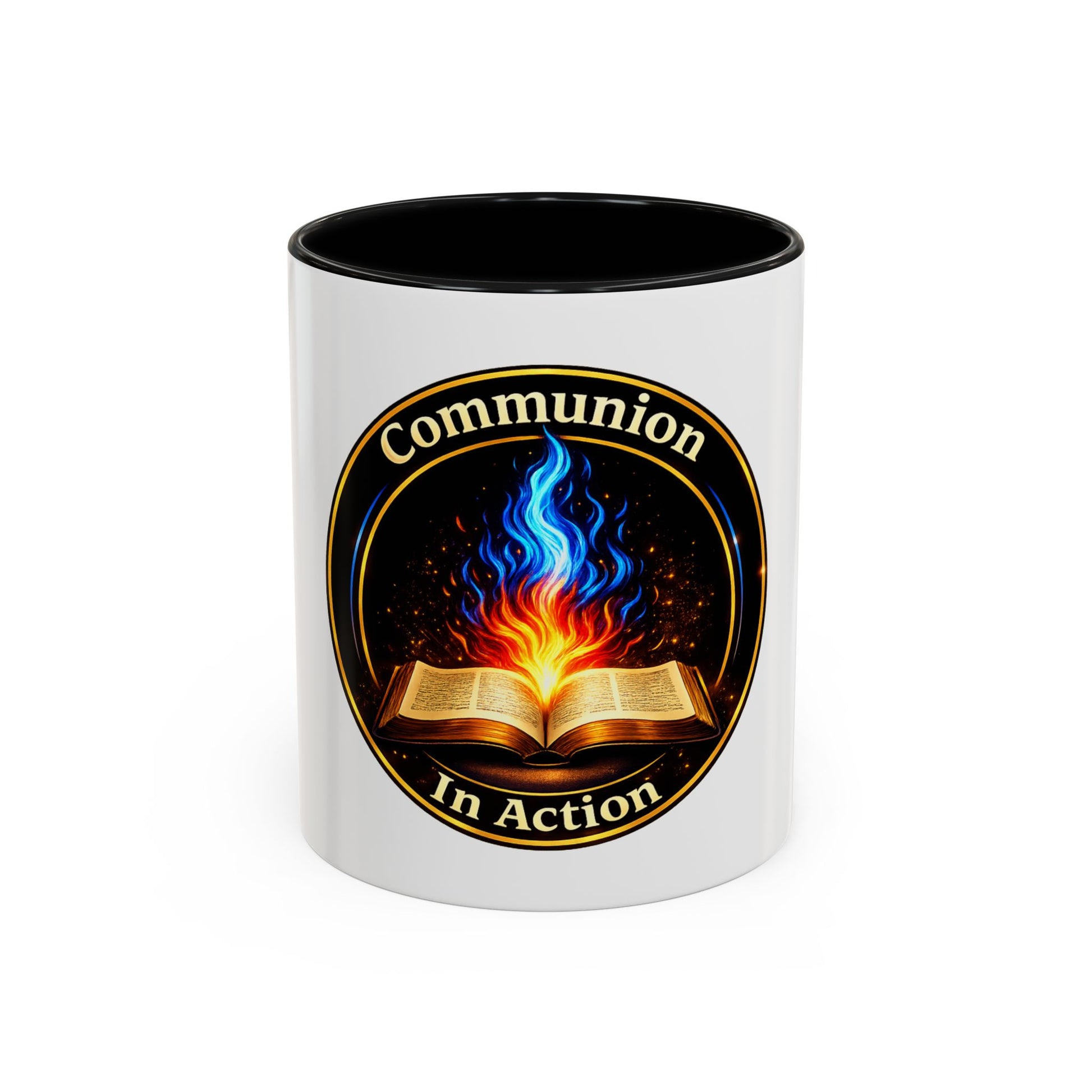 This ceramic accent mug blends vivid color contrast with thoughtful symbolism, making it a meaningful companion for everyday moments. A glossy white exterior frames a striking circular emblem—an open Bible with a blue and orange flame rising from its pages and the words “Communion In Action.” The design reflects faith that is received, lived, and carried forward through action.