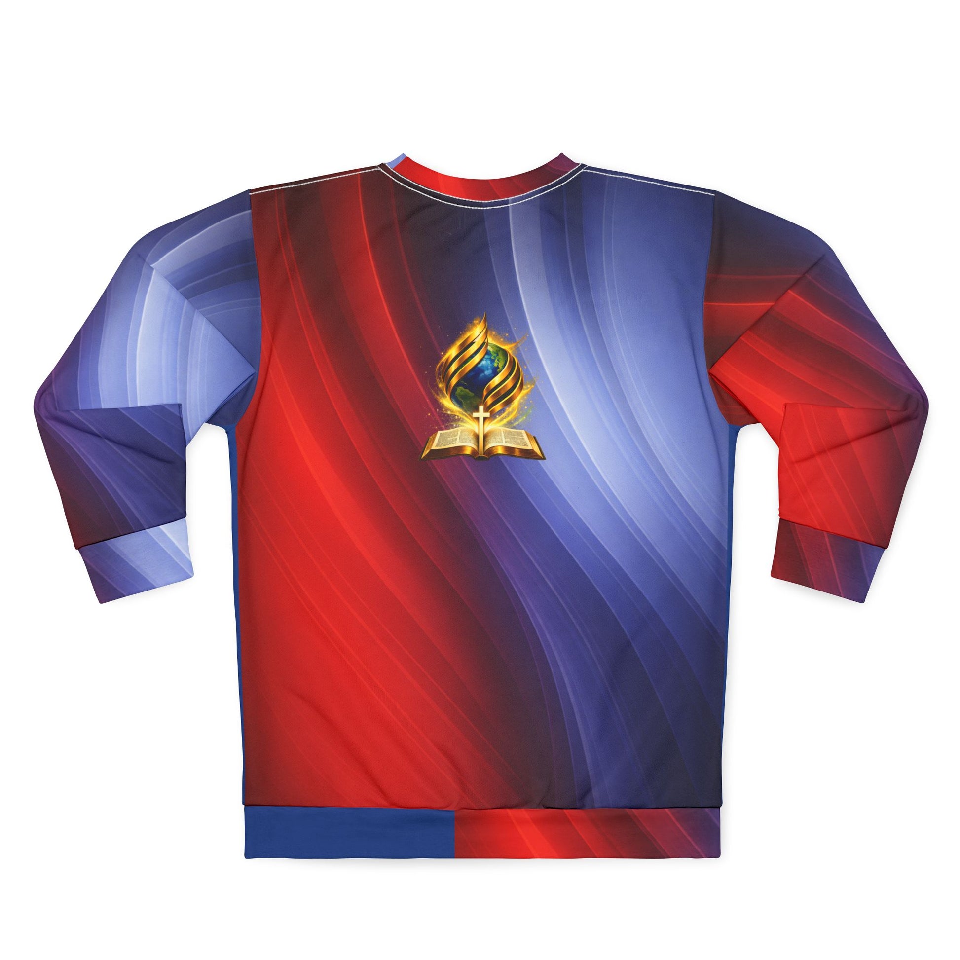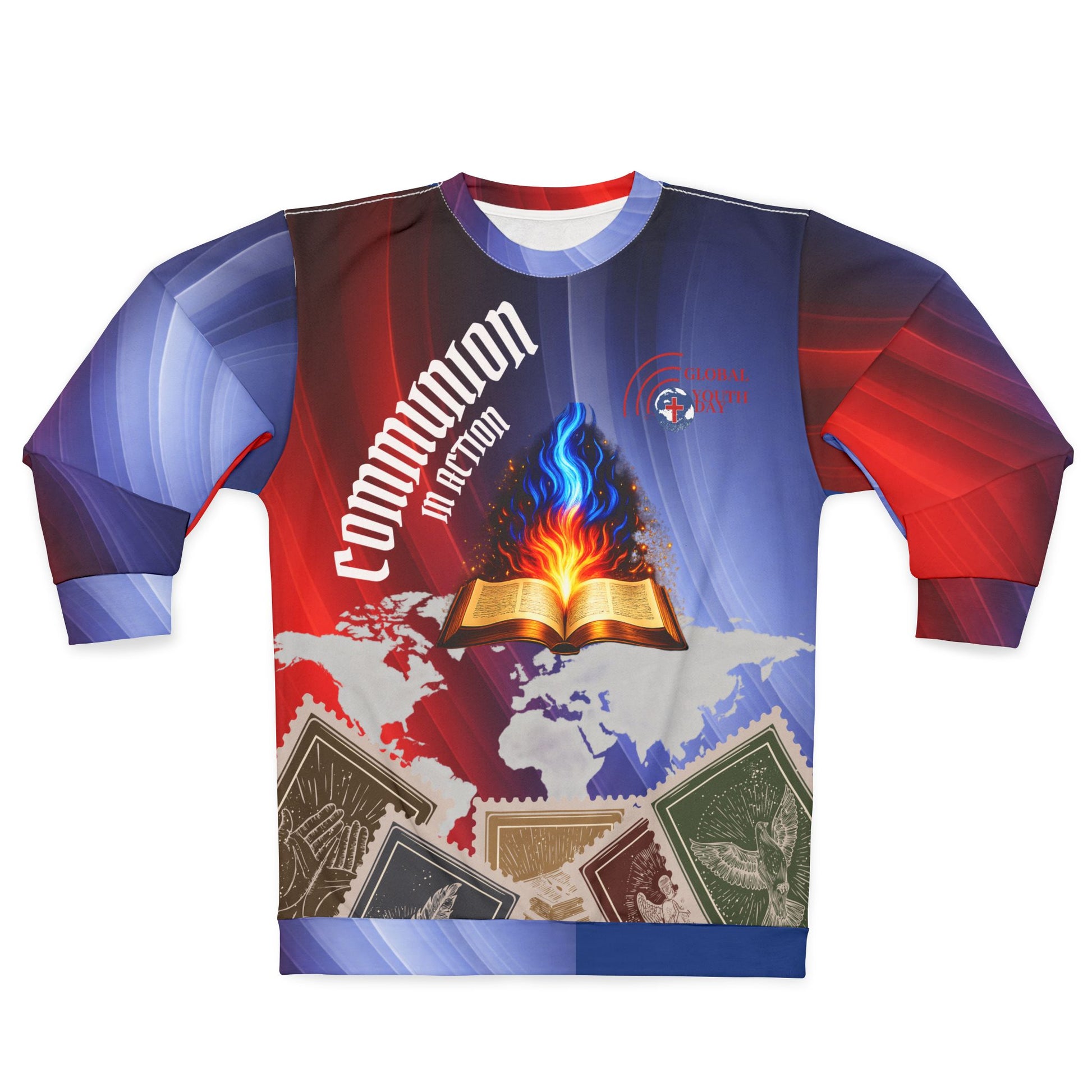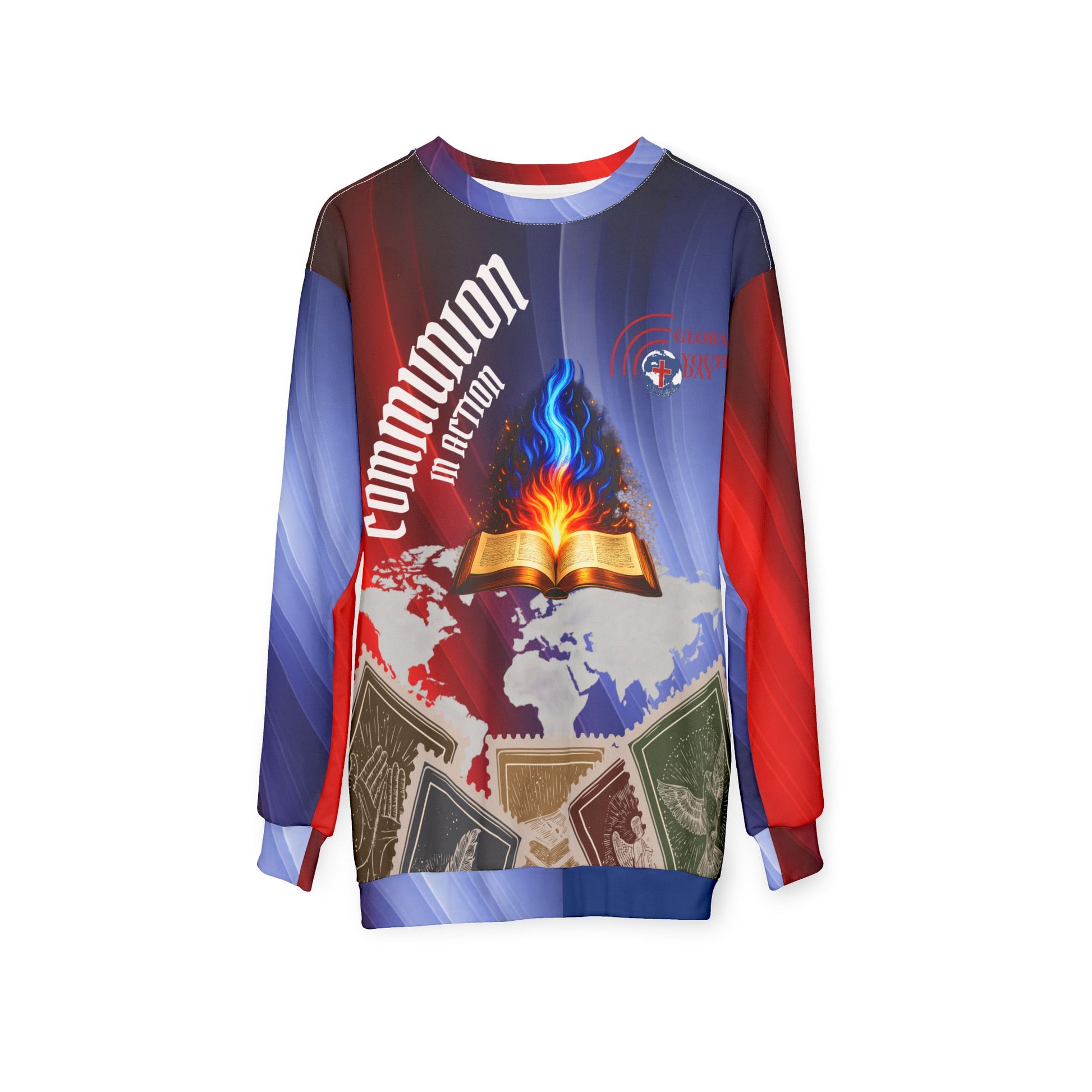 This all-over printed sweatshirt carries bold, meaningful imagery into everyday layering. Vivid reds and blues sweep across the fabric, framing a central open Book alight with a blue and orange flame set against a subtle world map. The design reflects faith rooted in Scripture and ignited for global outreach—movement with purpose.