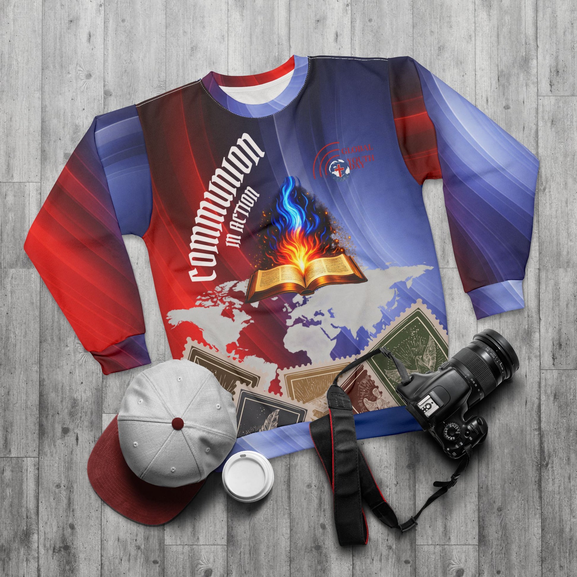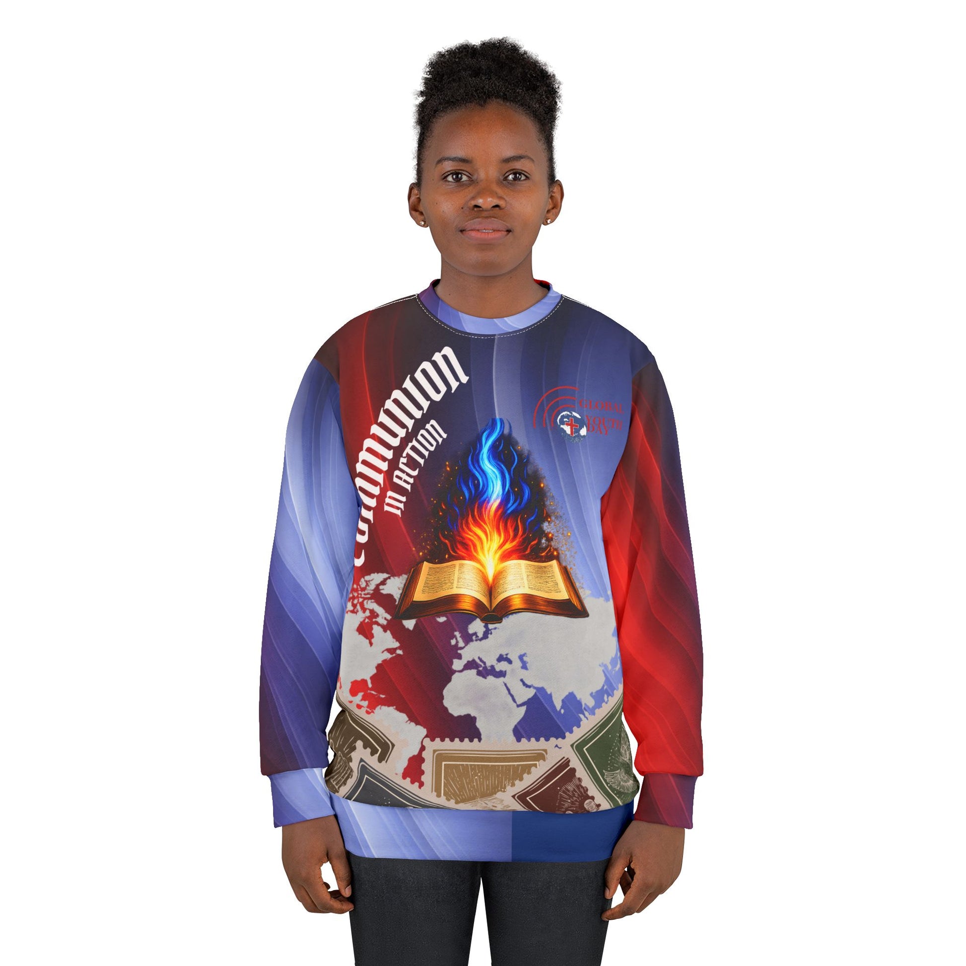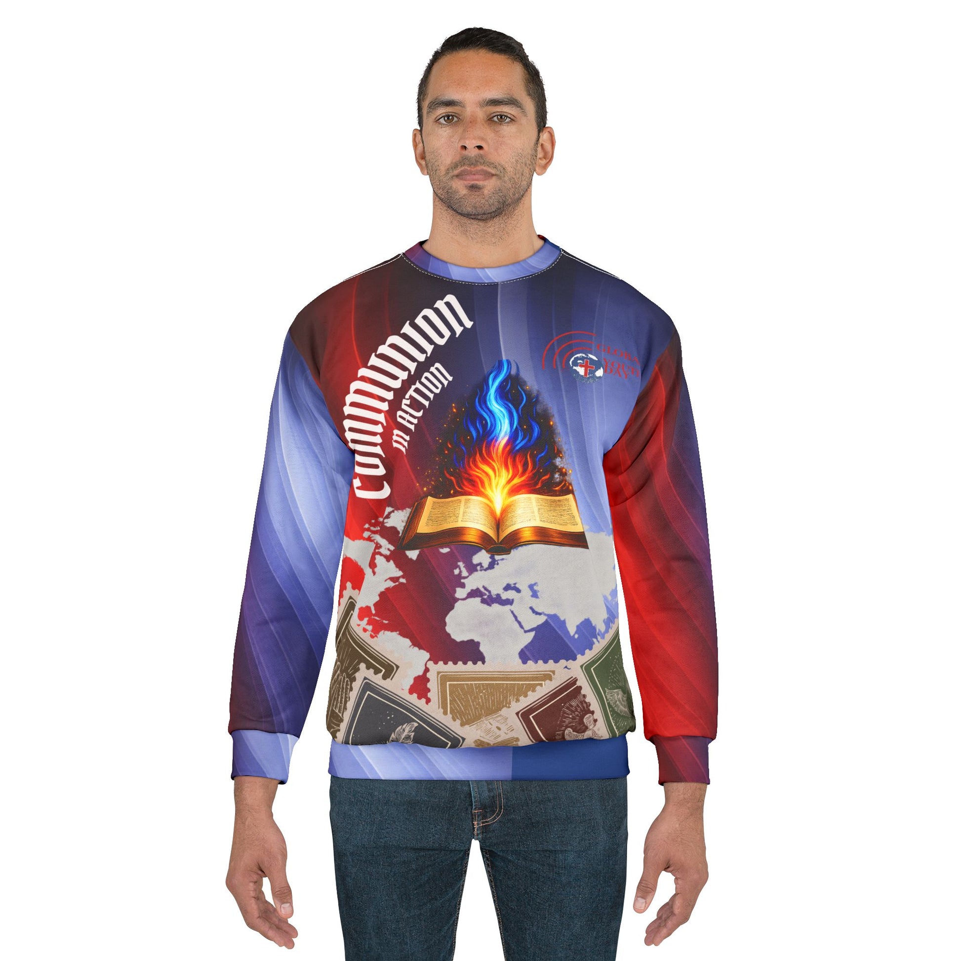 This all-over printed sweatshirt carries bold, meaningful imagery into everyday layering. Vivid reds and blues sweep across the fabric, framing a central open Book alight with a blue and orange flame set against a subtle world map. The design reflects faith rooted in Scripture and ignited for global outreach—movement with purpose.