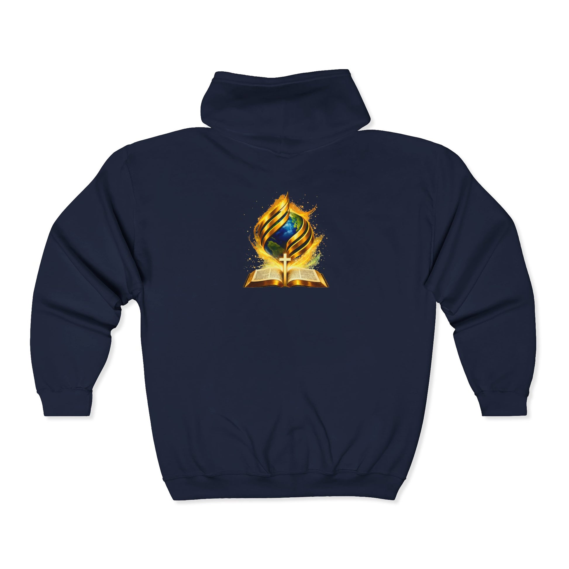 This zip-up hoodie carries quiet conviction—a soft, substantial layer designed for faith worn with clarity and care. A luminous open Bible with a rising flame anchors the design, embroidered and printed in gold and blue tones that stand out against the deep black backdrop. The result feels reverent and contemporary, visible without being flashy.
