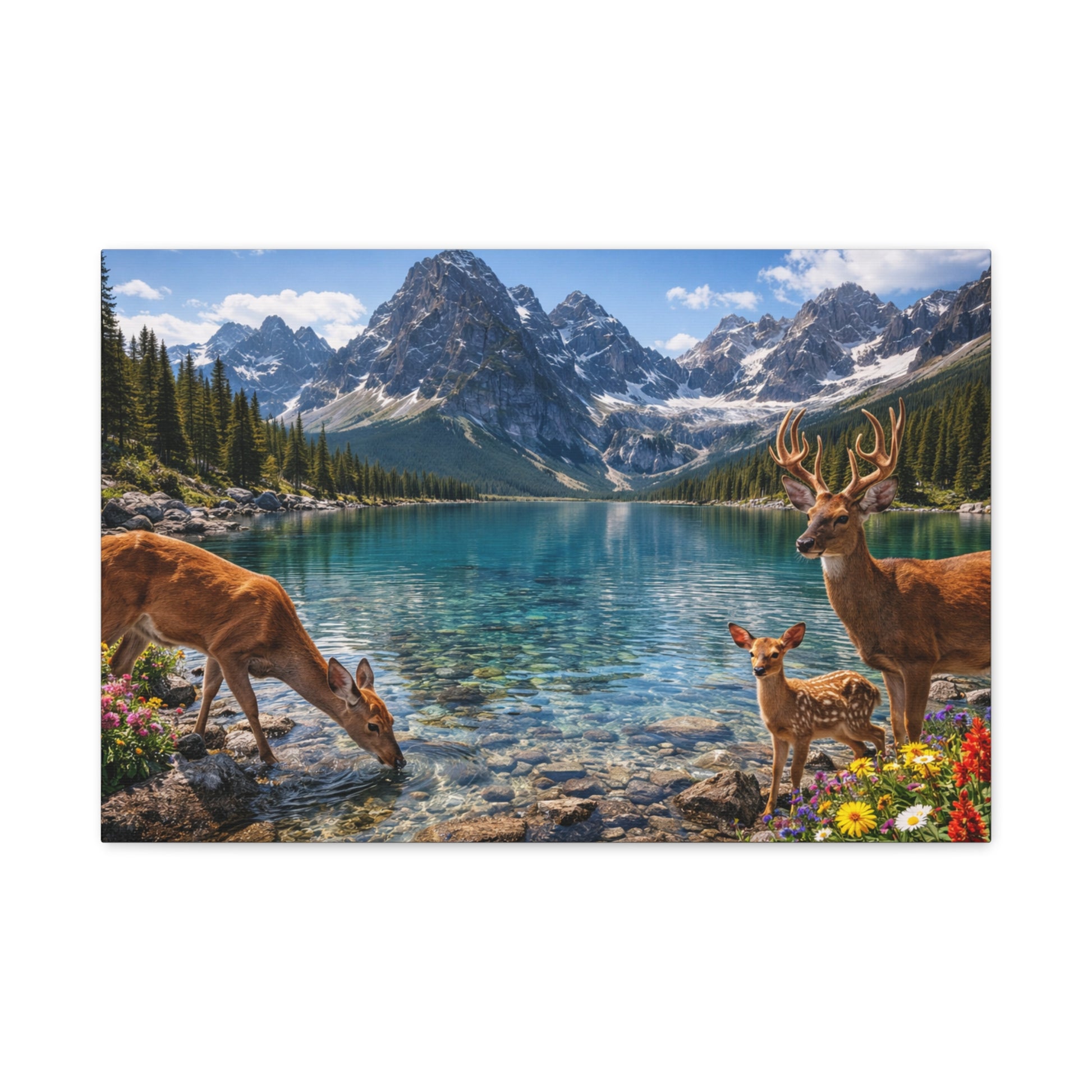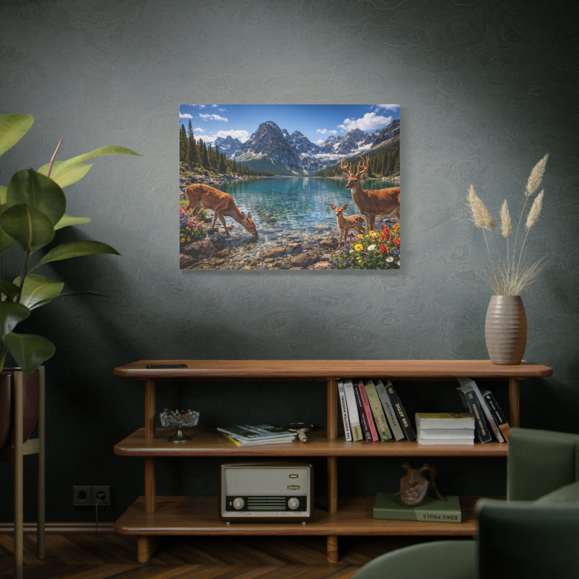 This matte stretched canvas captures a quiet mountain moment where creation rests in gentle harmony. Crystal-blue alpine waters reflect the sky, wildflowers gather along the shoreline, and a small family of deer stands peacefully at the edge—each element rendered in rich, natural tones that feel calm and unforced.