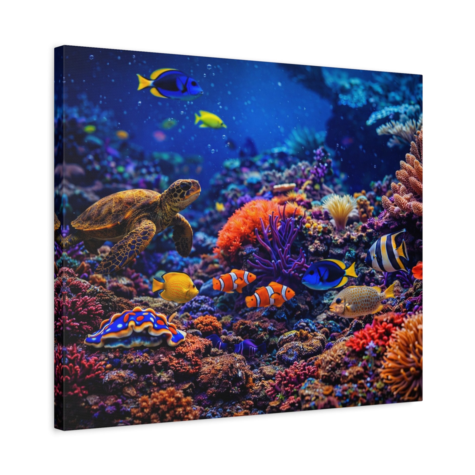 This stretched matte canvas invites you into the quiet wonder of a living reef, where color, movement, and calm exist in gentle balance. Beneath the surface, rich hues and fine detail reveal the graceful curve of a sea turtle, the patterned flash of clownfish, and the layered textures of coral—each element resting in its created place.
