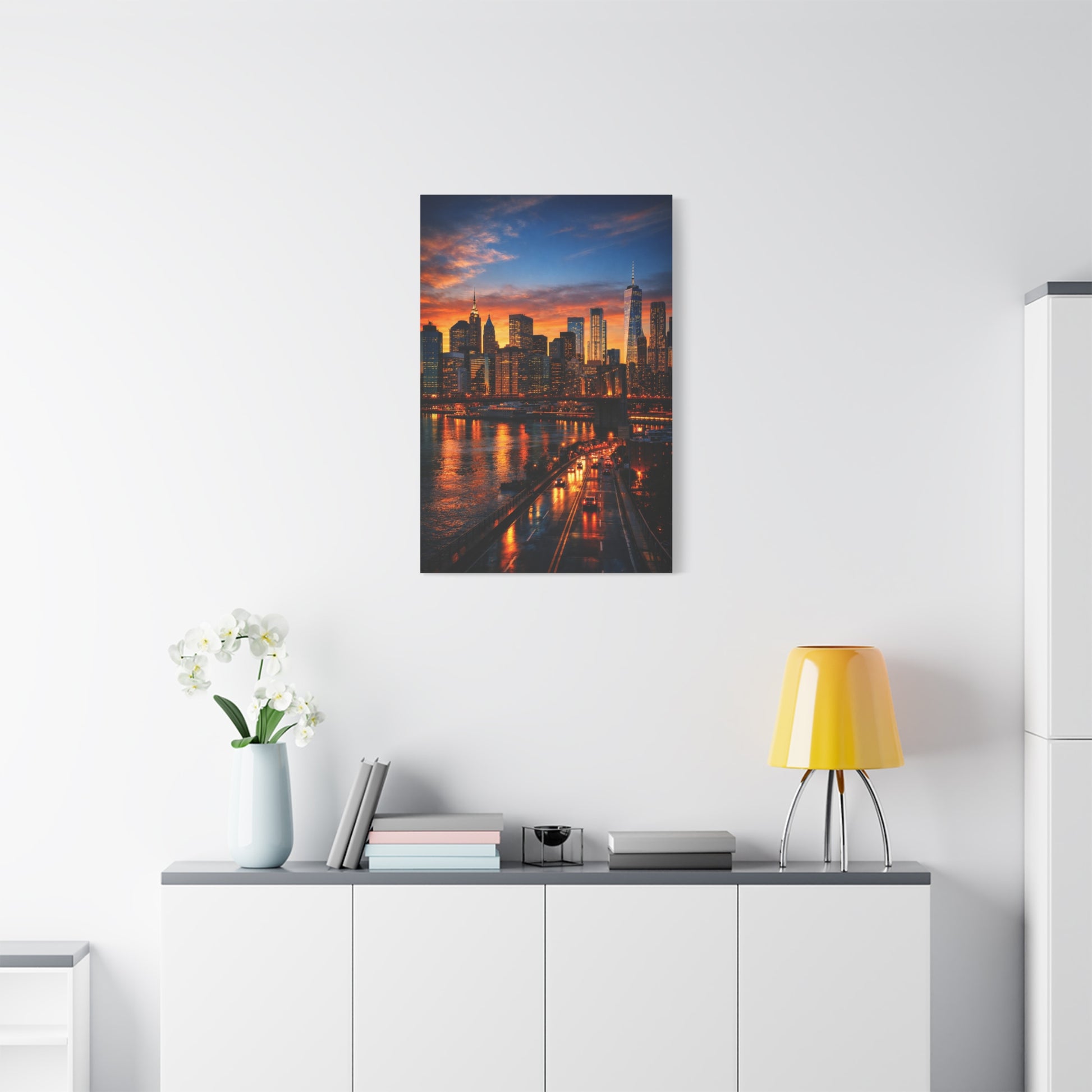 This stretched matte canvas captures the quiet glow of a city at dusk, where movement softens and light begins to rest. Rich, velvety color and fine detail reveal a skyline at sunset—golden reflections shimmering across water, gentle traffic streaks, and luminous clouds settling into evening calm. The scene feels alive yet unhurried, inviting the viewer to pause within the rhythm of the day.